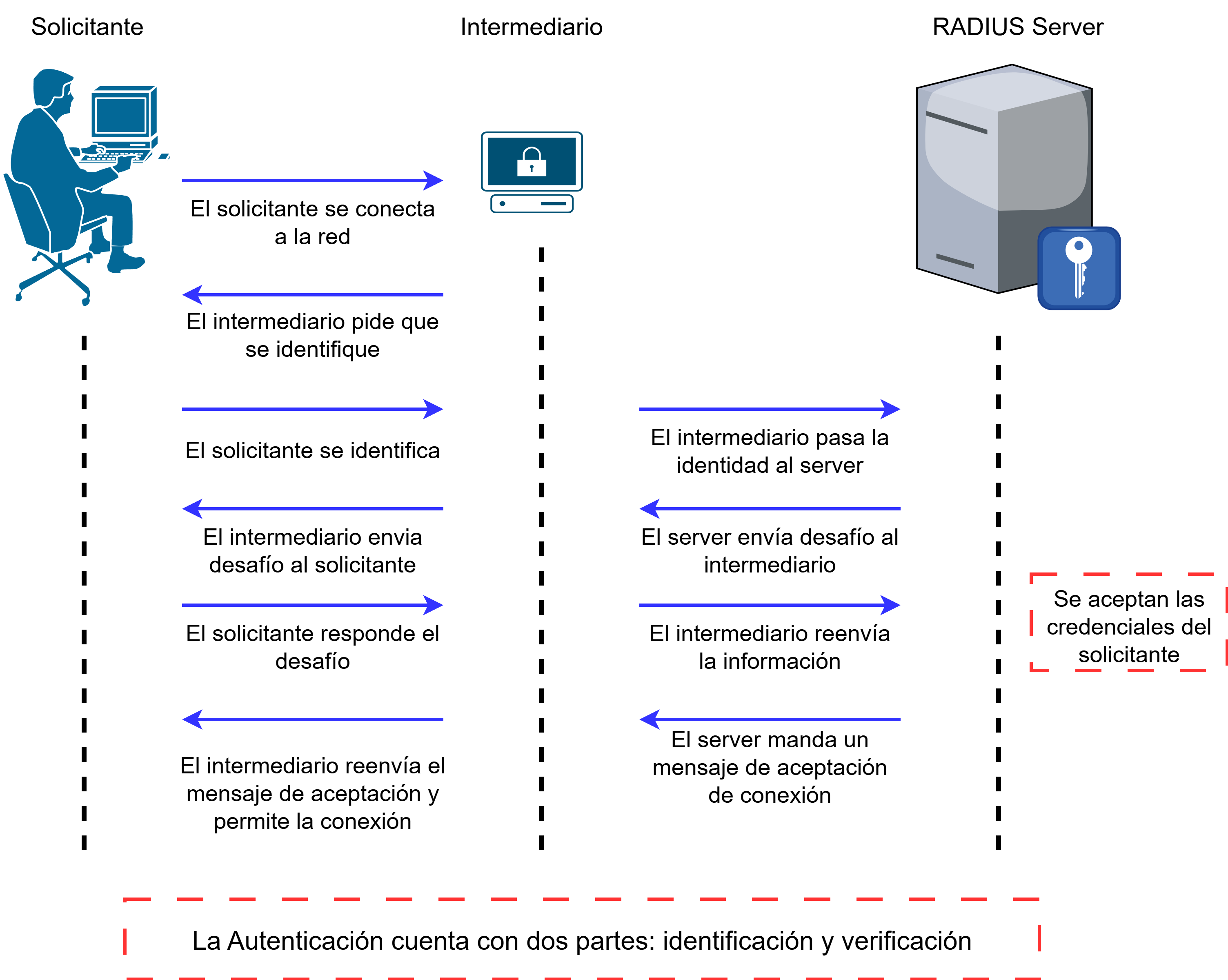 - 802.1X (Control de Acceso a la Red Basado en Puertos - PNAC): Este no es un protocolo de autenticación, sino un marco estándar de la IEEE que actúa como un guardia de seguridad en cada puerto de la red. No permite que ningún dispositivo envíe datos hasta que se haya autenticado correctamente. En este marco participan tres actores: