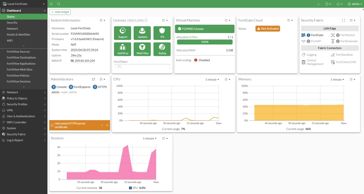 FortiOS: Es el sistema operativo diseñado específicamente para la seguridad que actúa como el cerebro del dispositivo. Su interfaz, visible en el panel de control, ofrece una vista centralizada de todo el estado de la red, desde el uso de CPU y memoria hasta las sesiones activas y las alertas de seguridad, como certificados no confiables.